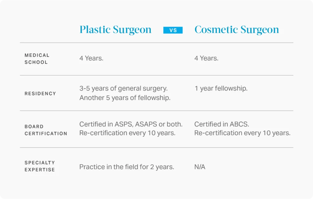A plastic surgeon primarily focuses onreconstruction procedures that are medically necessary, while a cosmetic surgeon focuses on elective procedures that can enhance one’s appearance and address common concerns. Both types of surgeons are required to complete medical school and a residency program.